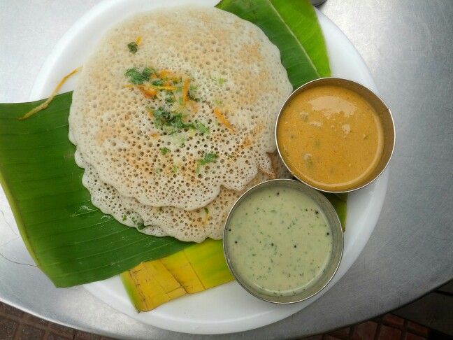 Millets mini appam with sambhar, peanut chutney and tomato chutney.