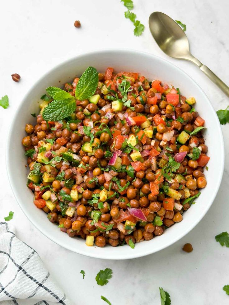 Kala chana (black chickpea) salad is highly nutritious, offering benefits like improved digestion (fiber), weight management (protein/fiber), stable blood sugar (low GI), strong immunity (vitamins/antioxidants), better heart health (potassium/magnesium), and sustained energy, making it excellent for muscle building, bone health, and overall vitality due to its rich profile of protein, fiber, vitamins, and minerals.