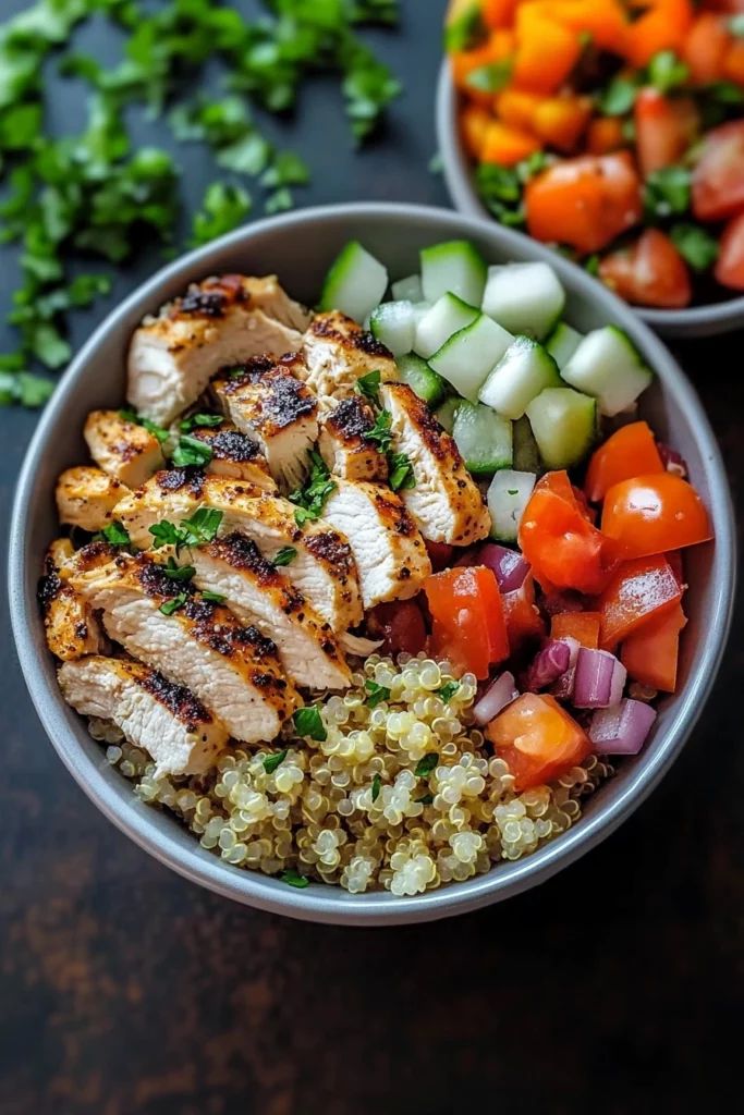 A quinoa chicken bowl offers balanced nutrition with complete protein, fiber, and micronutrients, supporting muscle health, digestion, and sustained energy, making it great for weight management and overall wellness. Key benefits include high protein for fullness and muscle repair, fiber for gut health, essential amino acids from quinoa, and a wealth of vitamins (B vitamins, E) and minerals (iron, magnesium, zinc). It’s naturally gluten-free and rich in antioxidants, promoting heart health and reducing inflammation.